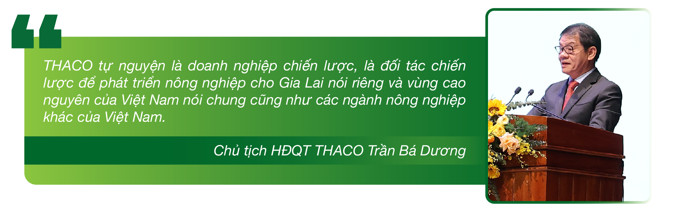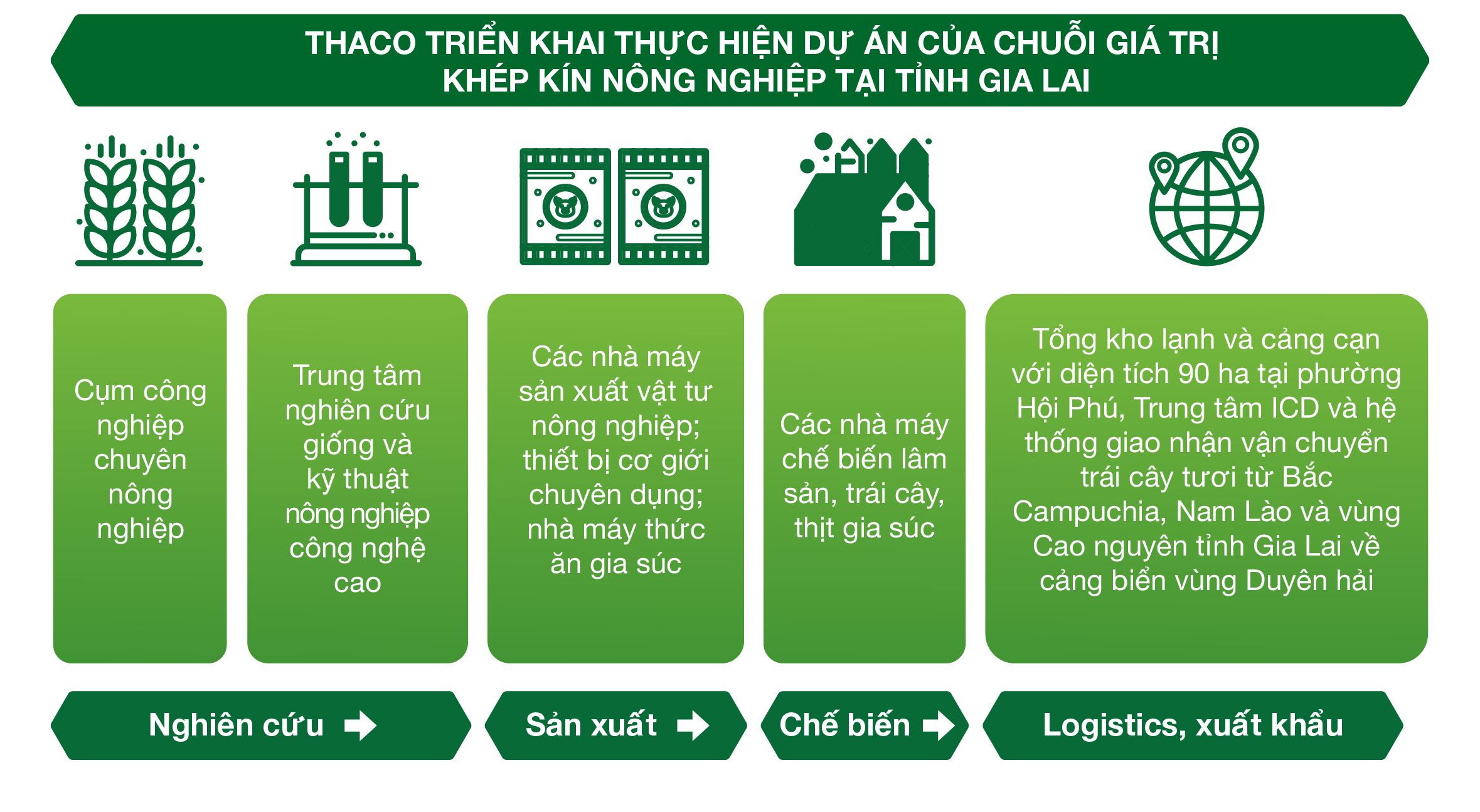 Với định hướng này, Gia Lai được xác định là một trong những địa bàn trọng điểm trong chiến lược phát triển nông nghiệp tích hợp của THACO, góp phần hình thành vùng sản xuất nông nghiệp bền vững quy mô lớn, tham gia sâu vào chuỗi giá trị và chuỗi cung ứng nông nghiệp toàn cầu.